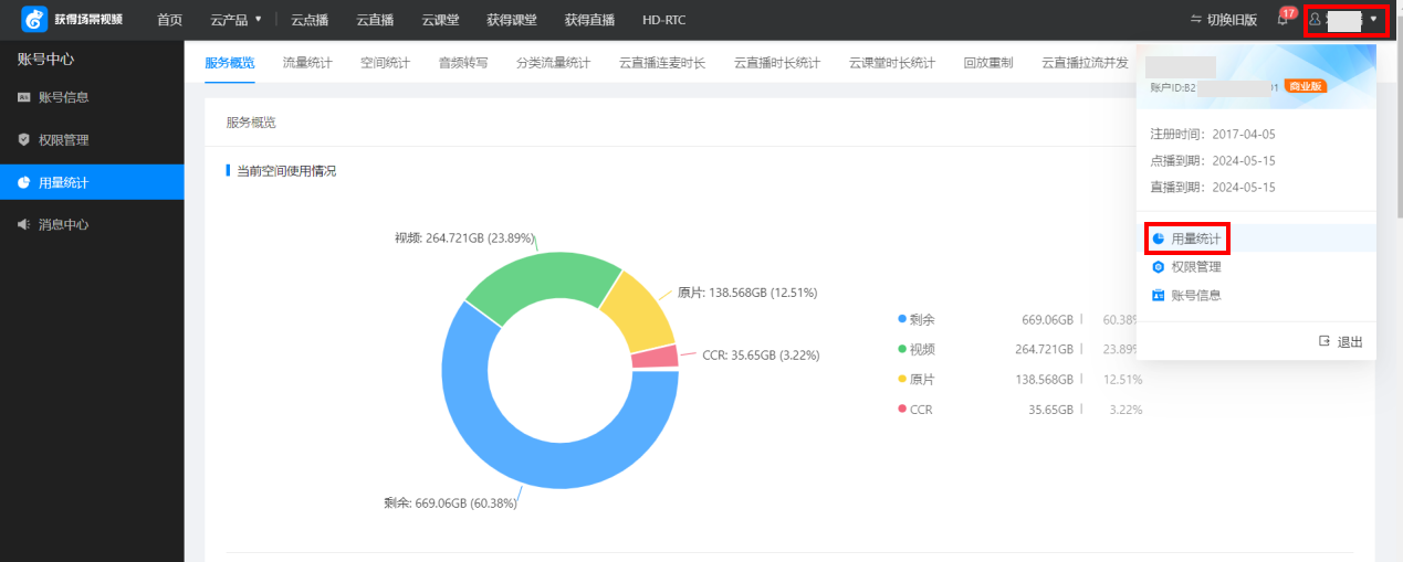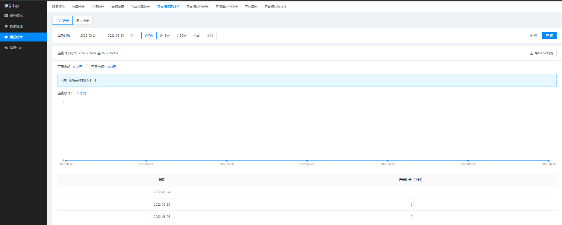 包括服务概览、流量统计、空间统计、音频转写、分类流量统计、云直播连麦时长、云直播时长统计、云课堂时长统计、回放重制、云直播拉流并发。