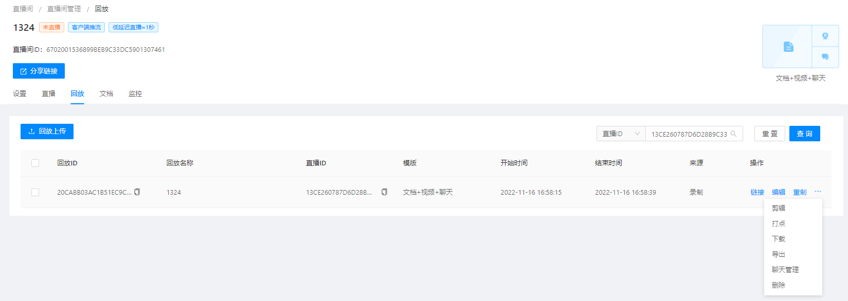 1.在直播间管理中点击“回放”按钮或在直播管理中点击“回放”按钮,即可进入回放管理页面