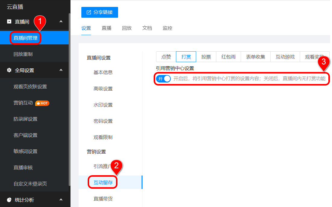 点击直播间管理在直播间列表中选择想要设置的直播间,点击营销设置>>互动留存,开启引用营销中心设置开关将引用营销中心打赏的设置内容,否则直播间内将无打赏功能。