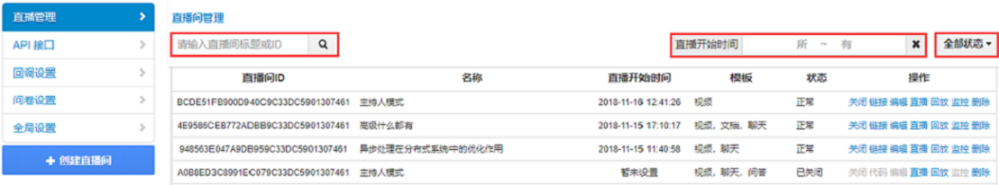 在直播管理页面可根据直播间标题、ID、开始时间、状态等信息搜索直播间。