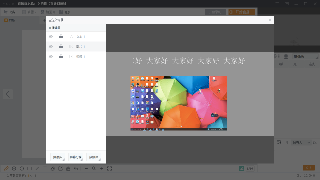 2)用户可在自定义场景中添加多个数据源,如摄像头,屏幕分享、多媒体