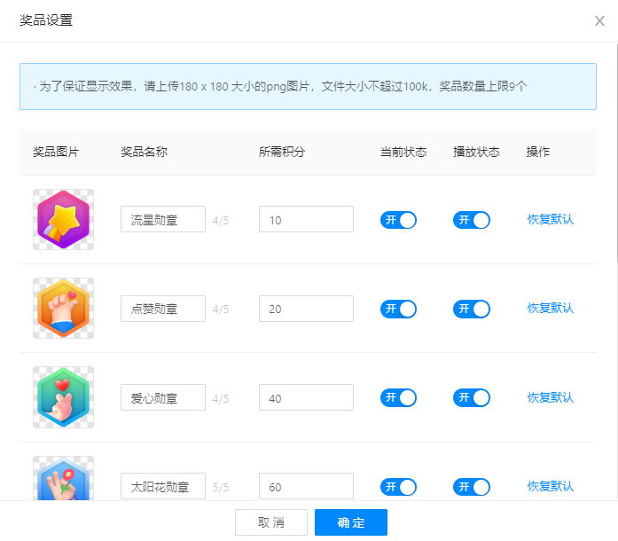 ·奖品设置为了保证显示效果,请上传180 x 180 大小的png图片,文件大小不超过100k,奖品数量上限9个