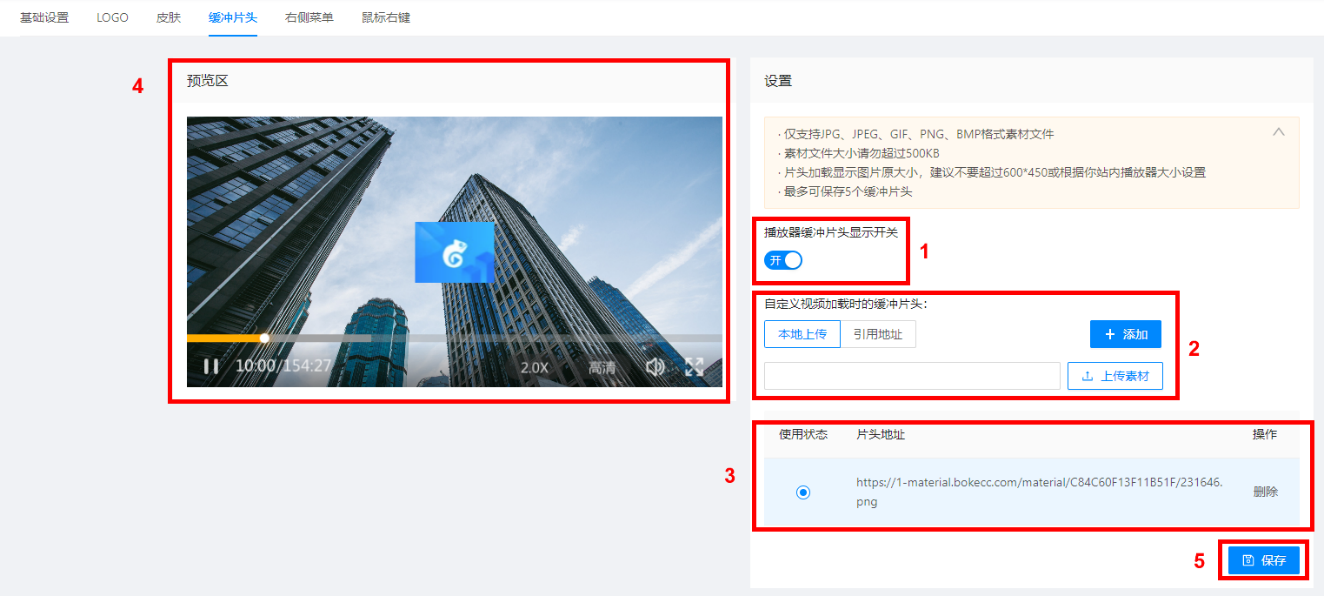 1.播放器缓冲片头显示开关 ·开关开启则加载时显示自定义的缓冲片头 2.自定义视频加载时的缓冲片头 ·本地上传,上传后点击添加 ·引用地址,填写后点击添加 3.片头列表 ·勾选使用状态则使用该缓冲片头,可在预览区显示效果 ·点击删除可删除该缓冲片头 4.预览区 ·预览缓冲片头设置效果 5.保存 ·设置好后点击保存即生效