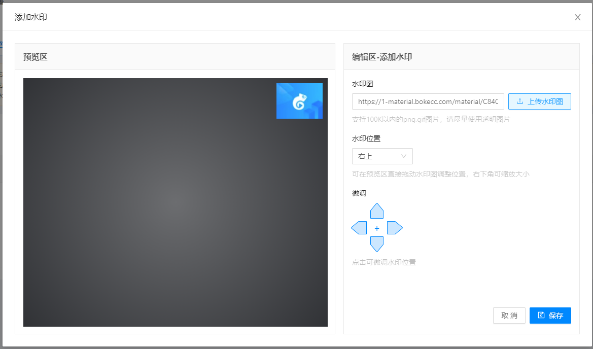 1.打开视频水印开关 ·开:视频全局设置为开启水印。 ·关:视频全局设置为关闭水印。 ·若对某一分类进行水印个性化设置,可选择【分类管理】,在一级分类后“操作”中的“设置”进行分类的水印设置 2.添加水印 ·上传水印图 ·调整水印位置 ·点击保存 3.水印操作 ·编辑 ·设为默认 ·删除